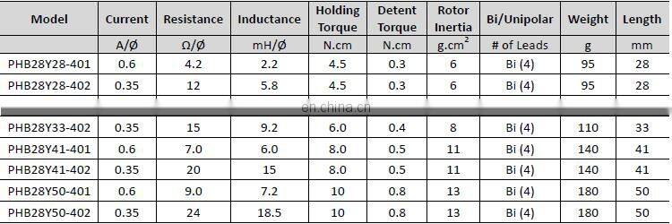 PHB28Y series hybrid stepper motors are supplied by one of the China's top stepper motor suppliers (PrimoPal Motor). These NEMA 11 square stepper motor with 1.8° step angle (200 steps/revolution) are made of high-quality cold rolled steel sheet and anti-high temperature permanent magnet. The body length of PrimoPal's NEMA 11 stepper motors ranges from 28mm to 50mm, and the holding torque could be as high as 10N.cm (14.1oz-in). These high-performance and high-reliability NEMA 11 stepper motors are terminated with four or six flying ended lead wires, and could be easily connected to the constant current or chopper drive controllers.