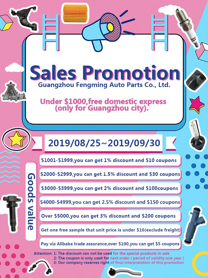 Guangzhou Fengming Auto Parts Co.,Ltd specialized in spark plug,timing belt,oil filter,air filter,fuel filter ,light bulb,ignition coil,brake pad,power steering pump,power steering rack,sensor,suspension and other auto parts for Toyota, Honda, Nissan, Mitsubishi, Volkswagen, Hyundai and many other cars,have more than 12 years of experience, it has obtained five years of Alibaba platform certification, is leading auto parts supplier in Guangzhou, China.Look forward to your cooperation in the future.