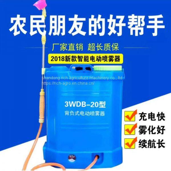 The electric sprayer is composed of a liquid storage tank connected through a filter screen, a coupling head, an aspirator (small electric pump), a connecting pipe, a nozzle, and a nozzle in order. The suction is a small electric pump, which is connected to the battery through a wire and a switch. Electrical connection, the battery box is installed at the bottom of the liquid storage tank. The liquid storage tank can be made with a recess for storing the battery. The advantage of the electric sprayer is that it eliminates the suction suction tube, which effectively eliminates the pesticide The filter hurts the operator's ills and saves labor, and the pressure of the electric pump is greater than that of a manual suction cylinder, which increases the spraying distance and range. The atomization effect is good, saving time, labor and medicine!