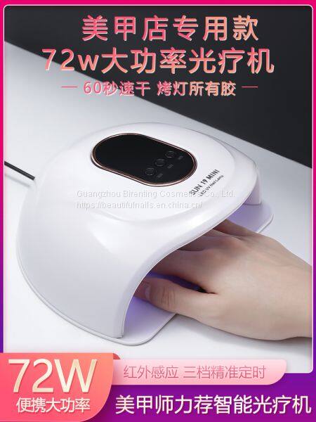 Nail lamp, also known as nail light therapy lamp. It is specially used for drying phototherapy glue in the nail process, and it is mostly used in nail salons. In the process of nail art, a layer of nail phototherapy glue is applied to the nail, similar to nail polish, but it is not easy to fall off than nail polish. It can generally be kept for more than a month. There are two kinds of nail lamps: ultraviolet lamps and LED lamps. Lamp, the main peak wavelength of ultraviolet light = 370nm (this wavelength is visible light, harmless to eyes, but it is recommended not to look directly at the lamp tube for a long time), but it can have a good drying and sterilization effect.