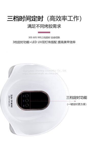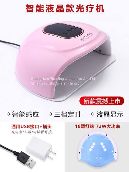 Nail lamp, also known as nail light therapy lamp. It is specially used for drying phototherapy glue in the nail process, and it is mostly used in nail salons. In the process of nail art, a layer of nail phototherapy glue is applied to the nail, similar to nail polish, but it is not easy to fall off than nail polish. It can generally be kept for more than a month. There are two kinds of nail lamps: ultraviolet lamps and LED lamps. Lamp, the main peak wavelength of ultraviolet light = 370nm (this wavelength is visible light, harmless to eyes, but it is recommended not to look directly at the lamp tube for a long time), but it can have a good drying and sterilization effect.