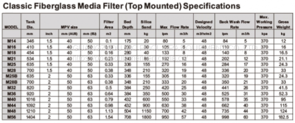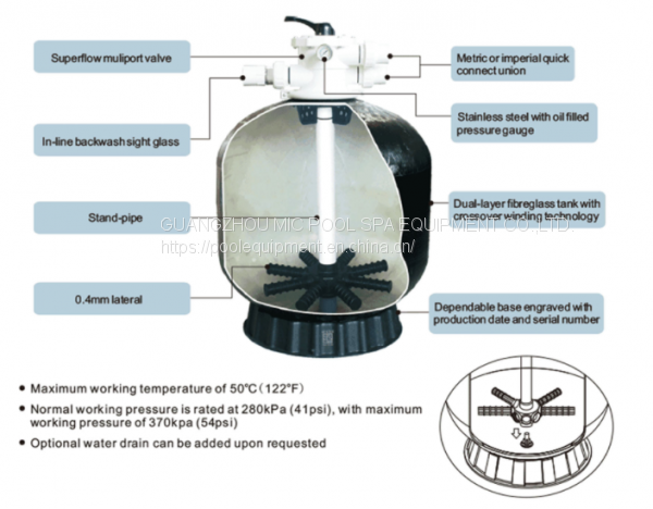 Bobbin-wound fiberglass reinforced tank is still the most popular standardin the industry after all. With UV-resistant surface finish, it is able to operate under prolong sunlight for years of reliability. Transparent lid is designed for easy inspection of sand bed. "M" series(M450-MS1200) filters are equipped witha six-position, 1.5" & 2.0" & 2.5" multiport valve and ABS laterals.