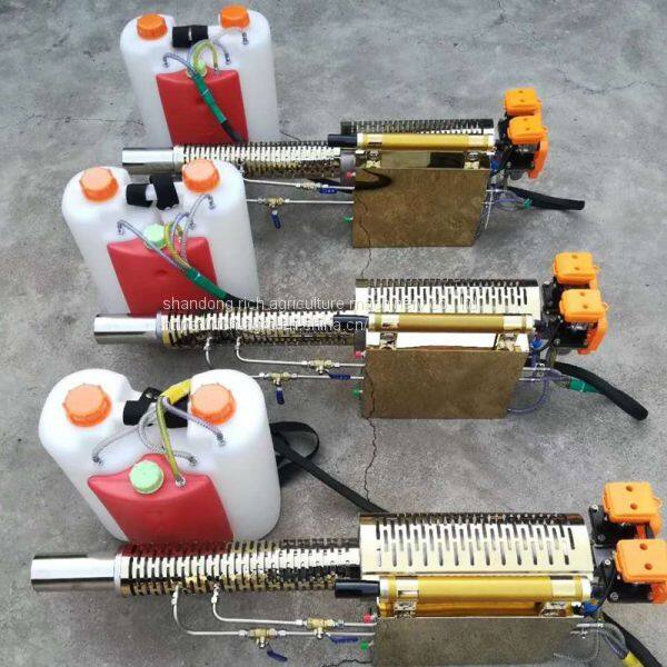 2.Smoke: need to add smoke agent(smoke agent or diesel fuel), if diesel fuel as smoke agent, it is best to use a double-tube mist machine, smoke suitable for large-scale spraying operations, smoke injection distance up to 20-30 meters, a box of agents can operate about 30 acres of land, Suitable for non-suitable for sex crop spraying operations, such as poplar, camphor and landscaping; It can also be used for killing operations. Smoke also has anti-freeze insulation and other effects.