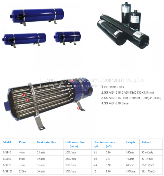 5. Four sizes: 40, 60 75, 120 kW, suitable for swimming pools of up to 450m36 Connects to different kinds of boilers, heat pumps and solar panel systems.