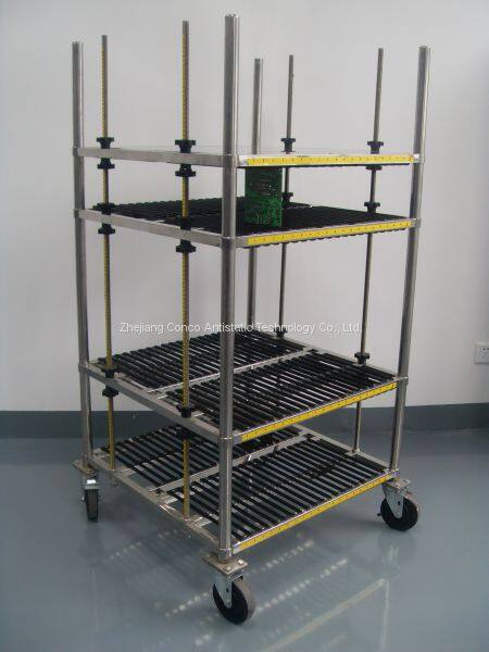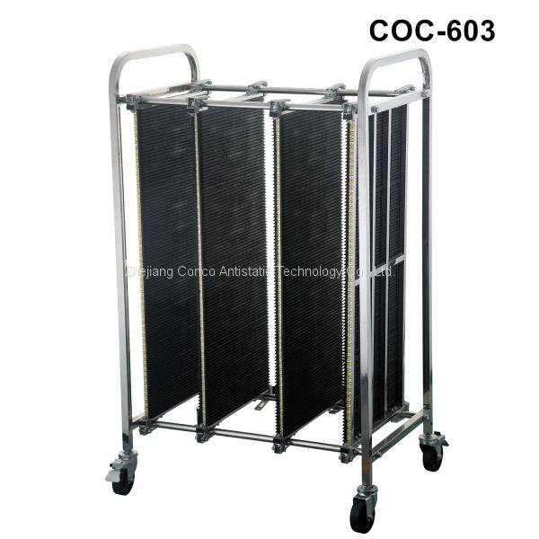 CONCO magazine rack/trolley cart is available with different types and sizes to meet customer's needs. The esd trolley will be classifed with a high and a normal temparature type,a plastic type and an alumimum type by their materials used, a screw locking type by the way of adjusitng PCB slots.