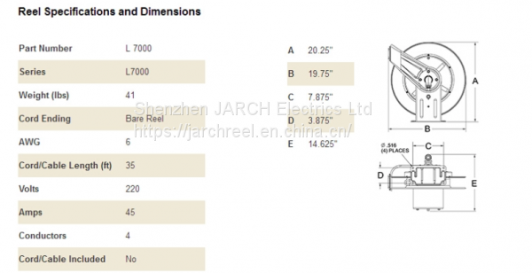 | JARCH series L 7000 power cord reels offer many different styles of outlets. Easy to mount and structurally strong, the power cord reels have robotically welded heavy gauge steel frame that attaches to most structurally sound surfaces. For indoor, non-weather tight applications only. |