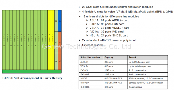 MSAN B1200 product line includes high (iAN B1205F/B1205E), medium (iAN B1205 /B1205v) devices that offer the benefit of converged access with an integrated TDM migration, POTS termination, DSL, Media Gateway and Ethernet/ xPON uplinks on the same platform.
