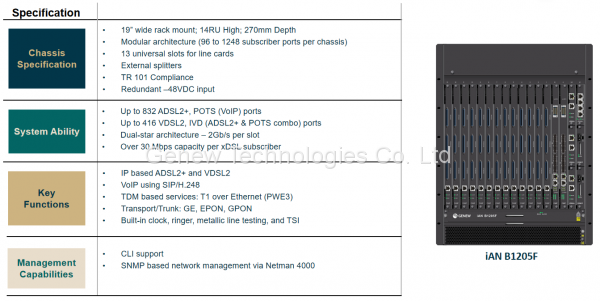 Genew iAN1200 series MSAN portfolio accommodates carrier-grade broadband access, telephony and data service interfaces in a single compact NGN platform, enabling operators to offer value added "Triple Play" and broadband business services and migrate to NGN while maintaining the traditional telephony services.