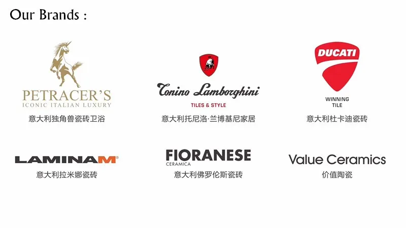 We not only deal with the tiles, but also some boutiques of Tonino Lamborghini, such as red wine, lighter, golf accessories, sunglasses and so on. Luxury is not just a product, but an atmosphere, a way of life. All of us should learn to understand life, enjoy life, taste life. And we also import other brands' tiles such as Dukati, Laminam and Floranese. At the same time, we still export the Value Ceramics to many countries all around the world.