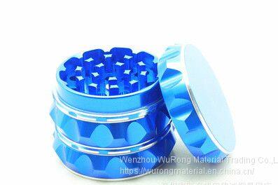 this smoke grinder is made of aluminium alloy and plat sounder polygonal shape with 4 layers, the diameter is 50mm, the height is 42mm, the weight is 104 grams, it has six colors ,they are red, purple, blue,green,black,yellow .