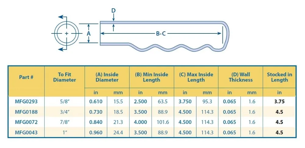 MOCAP's Dip-Molded Finger Nub Vinyl Plastic Grips not only improve appearance but also provide a secure comfortable grip on items with handles or levers. Our round vinyl grips are available in a variety materials, colors, hardness durometers (soft, semi-rigid or hard) and diameters to fit your application. Choose from our many material options including our traditional smooth & glossy vinyl or textured vinyl material. Flexible but durable vinyl materials can stretch onto slightly larger dimensions for a snug fit without splitting, tearing or shredding. All MOCAP round grip materials are tough, weather resistant and attractive.