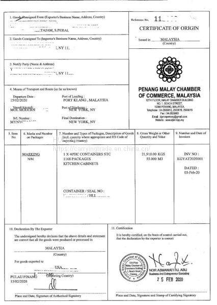 Sample of Certificate of Origin for Re-export Cabinets in Malaysia: