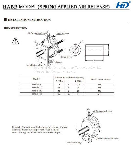 There are four models of spring applied air release brake, it including HABB-5, HABB-10, HABB-20, HABB-40. This normal braking brake is also can produce high braking force from 59N.m to 451N.m, braking force is depends on springs quantity, spring quantity more, its braking force is large, too. Details of it as below: