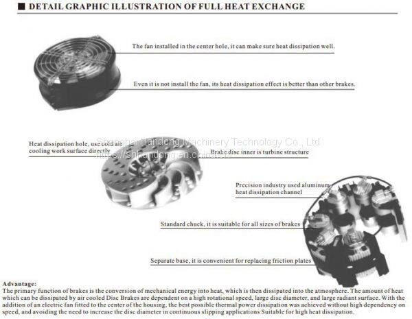 This kind of brake is easy for operation and braking. Handong made DBK250 multiple caliper disc brake can well replace RE CX250 fan cool combiflex pneumatic brake in dimension and function. The cooling fan voltage is safe 24V.