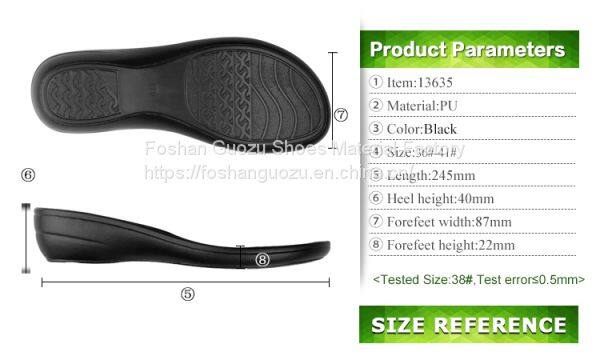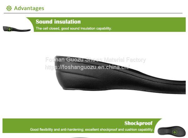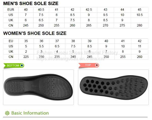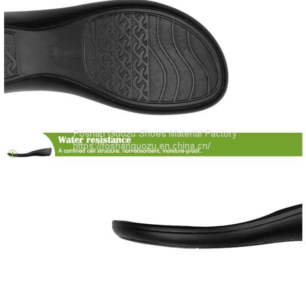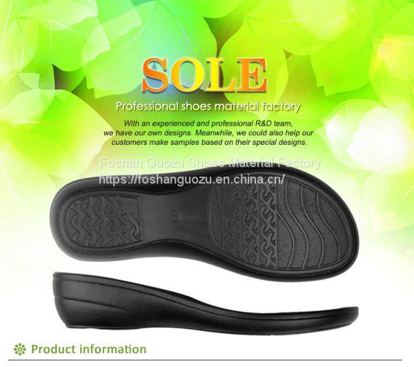 Foshan Guozu Shoes Material Factory which is located in Foshan City, about 45 minutes’ driving from Guangzhou airport, is specialized in manufacturing shoe soles in materials of Rubber,TPR, TPU, PU, one-time-injection eva, leather, PU& TPU injection, and other combined soles for a wide range of styles shoes, can meet different levels of customers’ requirements. And we are now also on the way of shoes design and development with our customers, becuase we have long term cooperative shoe factory closeby, which are professional in shoes making area.