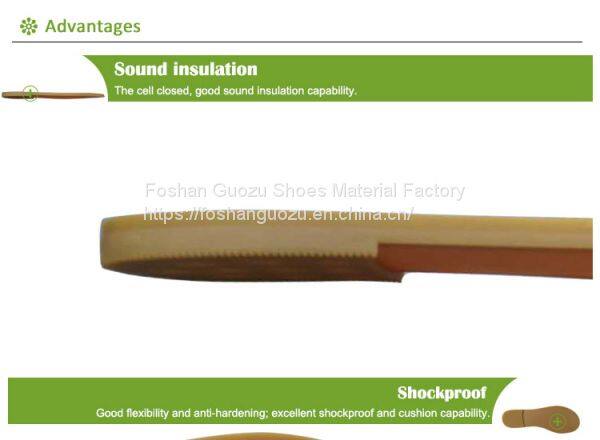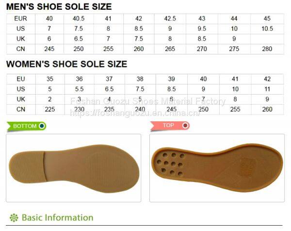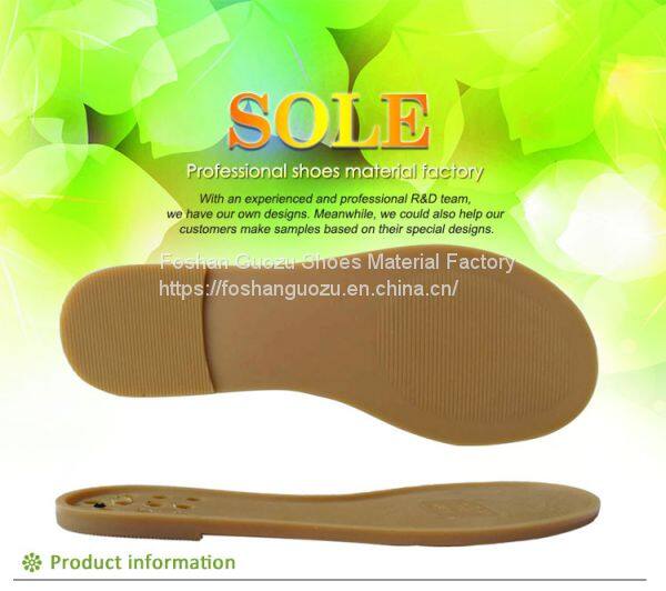 Foshan Guozu Shoes Material Factory which is located in Foshan City, about 45 minutes’ driving from Guangzhou airport, is specialized in manufacturing shoe soles in materials of Rubber,TPR, TPU, PU, one-time-injection eva, leather, PU& TPU injection, and other combined soles for a wide range of styles shoes, can meet different levels of customers’ requirements. And we are now also on the way of shoes design and development with our customers, becuase we have long term cooperative shoe factory closeby, which are professional in shoes making area.