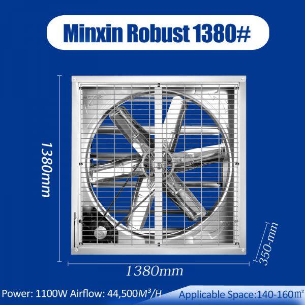 The standard heavy duty exhaust fan has a 1380 mm fan frame, with 6 blades, the blades and the frame are made from corrosion-resistant galvanized steel.