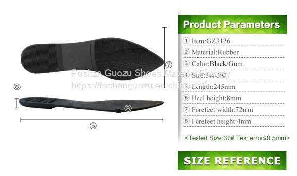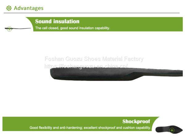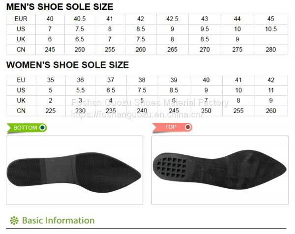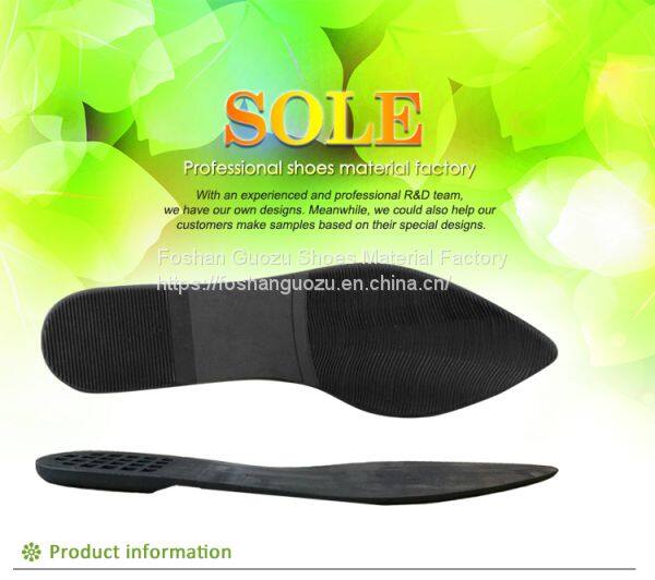 Foshan Guozu Shoes Material Factory which is located in Foshan City, about 45 minutes’ driving from Guangzhou airport, is specialized in manufacturing shoe soles in materials of Rubber,TPR, TPU, PU, one-time-injection eva, leather, PU& TPU injection, and other combined soles for a wide range of styles shoes, can meet different levels of customers’ requirements. And we are now also on the way of shoes design and development with our customers, becuase we have long term cooperative shoe factory closeby, which are professional in shoes making area.