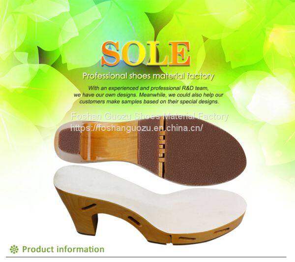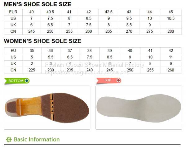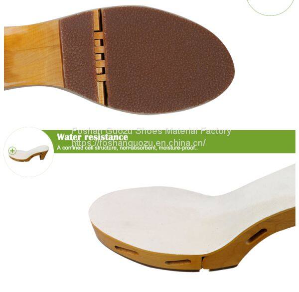 Foshan Guozu Shoes Material Factory which is located in Foshan City, about 45 minutes’ driving from Guangzhou airport, is specialized in manufacturing shoe soles in materials of Rubber,TPR, TPU, PU, one-time-injection eva, leather, PU& TPU injection, and other combined soles for a wide range of styles shoes, can meet different levels of customers’ requirements. And we are now also on the way of shoes design and development with our customers, becuase we have long term cooperative shoe factory closeby, which are professional in shoes making area.