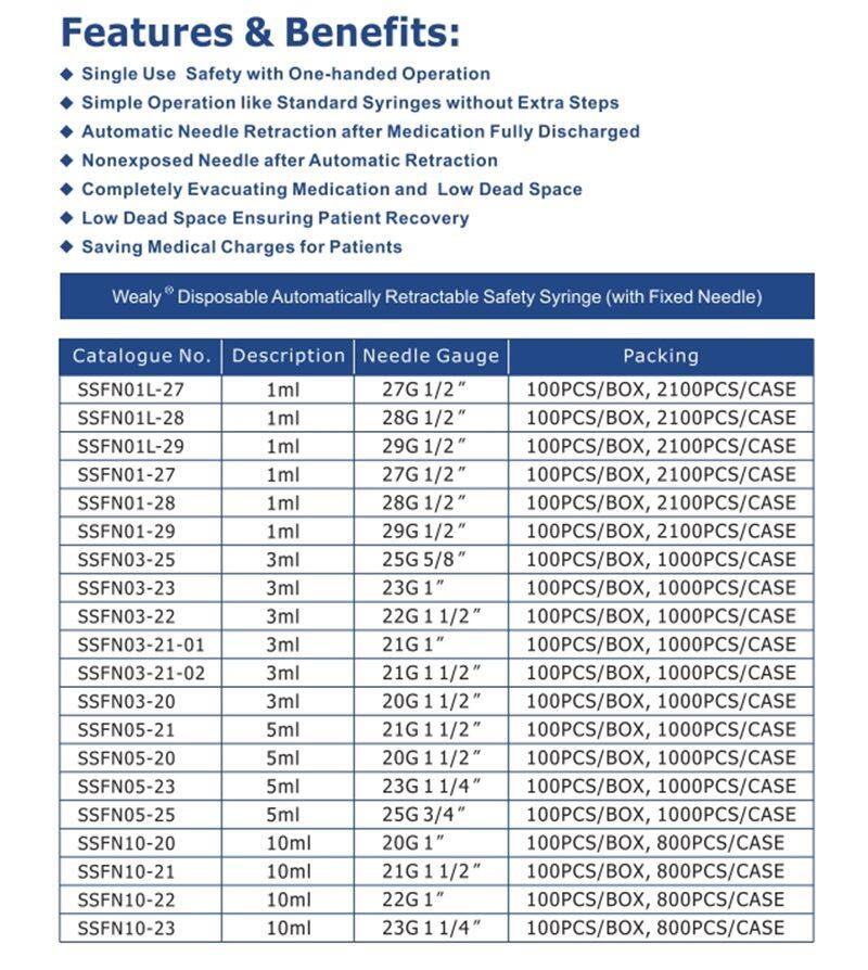 1. After the injection of the medicine solution, the needle of this product automatically retracts from the body without exposing the needle, reducing the risk of needle puncture and infection. It can be used once, operated with one hand, and is easy to operate;