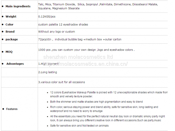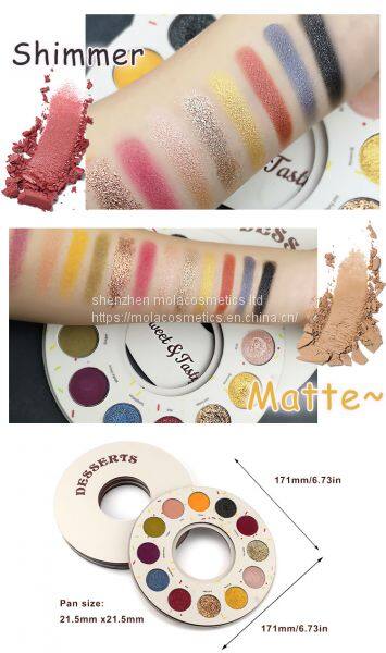 The Circular shape Doughnut eyeshadow palette is designed by Mola cosmetics soley,Which contains matte ,shimmer ,diamond and glitter eyeshadow inside.It's suitalble for you to do different looks at any occassions.We have made 50 pcs samples out to test the market and get a very good feedback ,espcially for the market in America.So we would like to introduce the palette to all of you who like this design and do customize colors and brand.Welcome to inquiry.