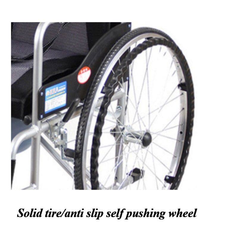 3. Rear wheel: 24 inch solid tires, aluminum alloy profile with 36 spokes; Equipped with high-strength double wave handwheels and designed with anti slip properties.