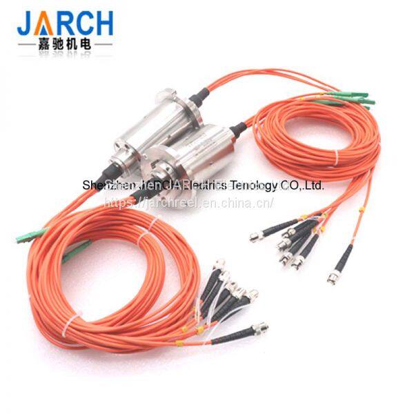 Fiber Optic Rotary Joint, also known as fiber optic slip ring, fiber optic rotary connector, optical hinges, etc. This slip ring adopts optical fiber as media for transmitting data, providing the best technical solution for elements of system to transmit data when rotating. It is especially suitable for equipments that require unlimited, continuous or intermittent rotation and transmit large capacity of data and signals from stationary position to rotary position. It can improve mechanical performance, simplify system operation, and avoid damage to fiber optic due to rotation of moving joints. The fiber optic rotary joints can be used with a traditional electric slip ring as a photoelectric hybrid slip ring to transmit power and high speed data.