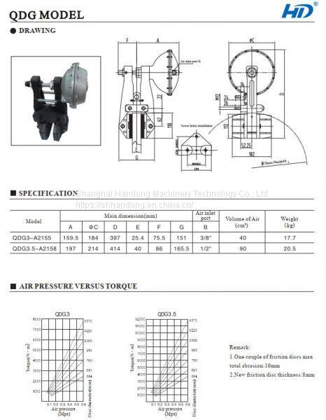 There are two models of it: QDG3-A2155, QDG3.5-A2158. They can produce high braking force after inputting air source. Following is the detail technical data of this type brake: