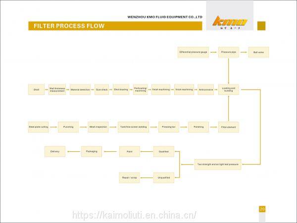 KMO reminds the user that it is necessary to clean the filter element when the differential pressure gauge shows that the difference of the inlet and outlet pressure reaches 0.03MPA (or specified by the user). The cleaning step is that: ①cutting of the inlet and outlet valves of the filter to ensure that there is no pressure and medium in the inner cavity; ②taking out the detachable filter element and using a brush to gently remove impurities; ③reloading. If the cleanliness of the filter element still cannot meet the demand after cleaning, it is recommended to replace with a new filter element.