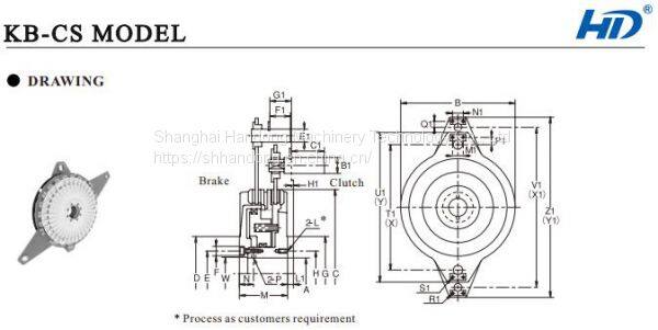 Shanghai HD manufactured KB model pneumatic clutch and brake unit with superior quality, body use good and famous brand ductile cast iron, good mechanical properties. Springs and sealing parts are imported, it is greatly prolong clutch’s service life. Especially the clutch and brake’s lining, it is casting by Japanese wearable, durable non-asbestos composite material, so as to further improve this clutch and brake unit grade.