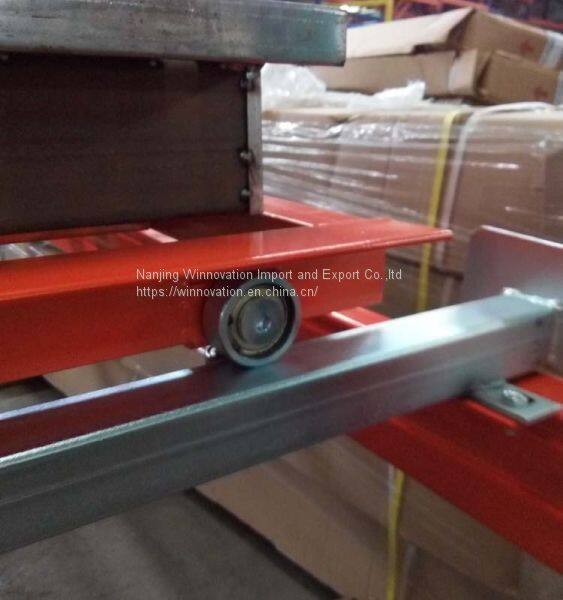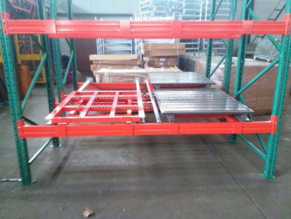 The push-back shelf is connected by a multi-layer trolley between the front and rear beams, and the stacked goods are placed from the outside. Push the trolley in, and the goods stored later will push the original goods into it.