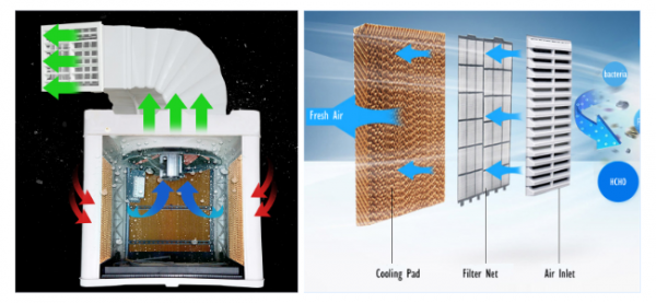 The water air cooler uses a fan to draw in the hot air, and passes over water-moistened pads, the water-moistened cooling pads immediately cools the air, then the evaporative cooler releases this cool moisturized air into the space.