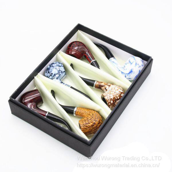 the tobacco pipe is made of wood and resin, its length is 255mm and the pipe diameter is 55mm, it has different heads with varous colors, its weight is 416g and 6 pipes as a whole set in a gift carton.