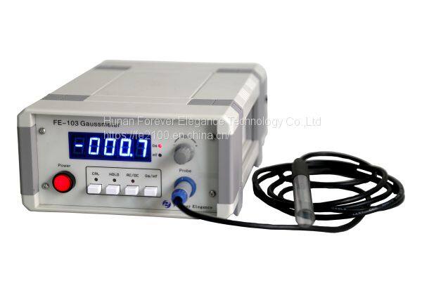 FE-103 Gaussmeter is a benchtop Gaussmeter designed and manufactured based on the new development of the Hall effect magnetic field strength measuring instrument, using high-stability constant current source circuit technology. The test probe adopts imported GaAs linear Hall chip, the difference between the probes is very small, and the user can directly replace it if it is damaged. It is an ideal AC and DC magnetic field test instrument. The instrument has functions such as AC and DC measurement, peak hold, and north and south pole judgment. It can be used for the inspection of AC and DC magnetic field and the peak of magnetic field, the distribution of AC and DC magnetic field, the inspection of permanent magnet magnetization, the inspection of magnetic field distribution in AC and DC coils, the inspection of the gap magnetic field of AC and DC electromagnets, and the inspection of conventional AC and DC magnetic fields. .