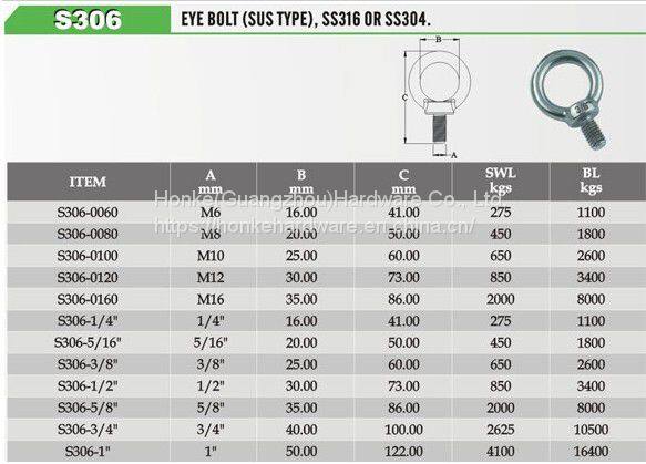 Stainless Steel 306 Lifting Eye Bolt Polished Eye Screw Bolts For Rigging Hardware
