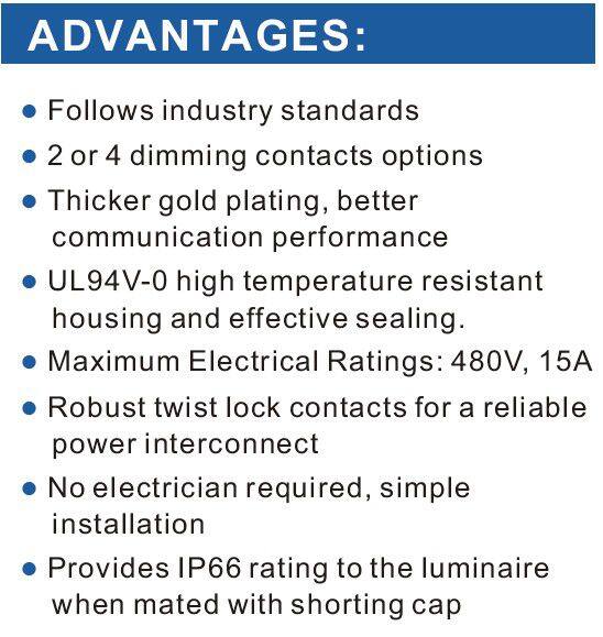 is available with two or four dimming contacts to support either 0-30 VDC dimming methodsor Digital Addressable Lighting Interface (DALI), while providing a reliable power interconnect