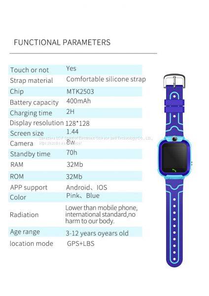 SCREEN 1.30 inch IPS Touch Colorful display , PIXEL 240*240 Solution MTK2503, 260MHZ GPS MTK2503,BD2,1561.098MHZ/L1,1575.42MHZ C/A code AGPS GPRS Class12, location time 26 seconds LBS Accuracy 500m LBS L1, 1575.42MHZ C/A code Location LBS,GPS,AGPS GSM,GPRS 850/900/1800/1900 SIM card Micro SIM card Camera 0.08MP Calling Support,2G network SOS Support G-sensor Support Battery 400mAH, standby 100hours Remote monitoring Support Battery Lithium batter 400mAH, Standby 3days Dimension 31*52*11.8mm..