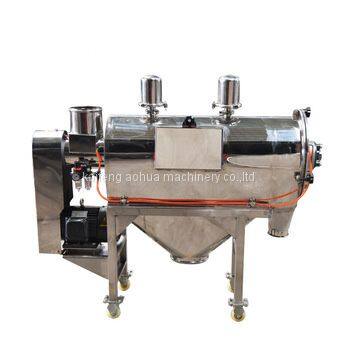 The shape of this sieve mesh is cylinder, built in machine body. The material is passed through the screw conveying system, mixed with the airflow and atomized into the net tube.; the wind turbine blade in the net tube make the material be subjected to the centrifugal force and ,the cyclone propelling force at the same time, spraying over the sieve ,discharge from the fine material outlet. Some material can't pass the sieve discharging from coarse material outlet.