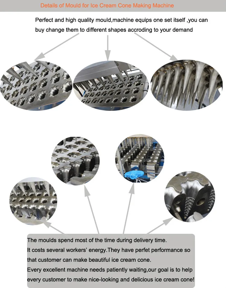 Professional for ice cream cone machine.about this ice cream cone machine the same species of mold can be used interchangeably,to produce different shapes of cone,can also according to the specifications of customer’s capacity design and color shape for its special design and manufacture.