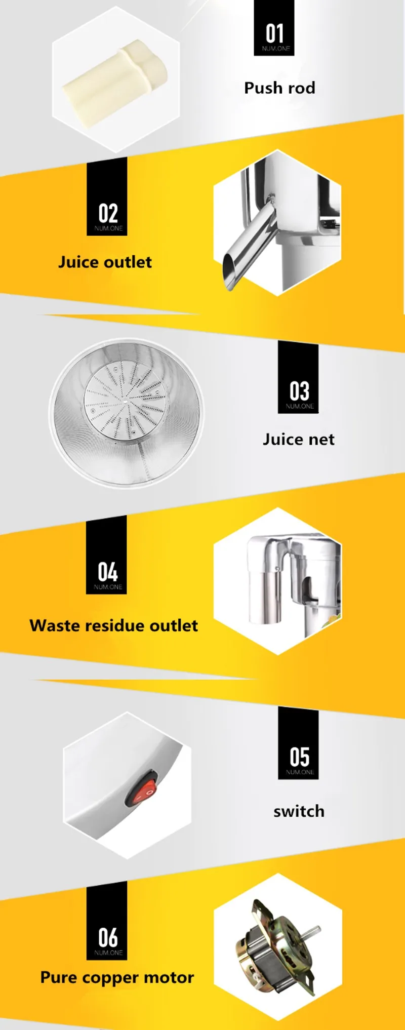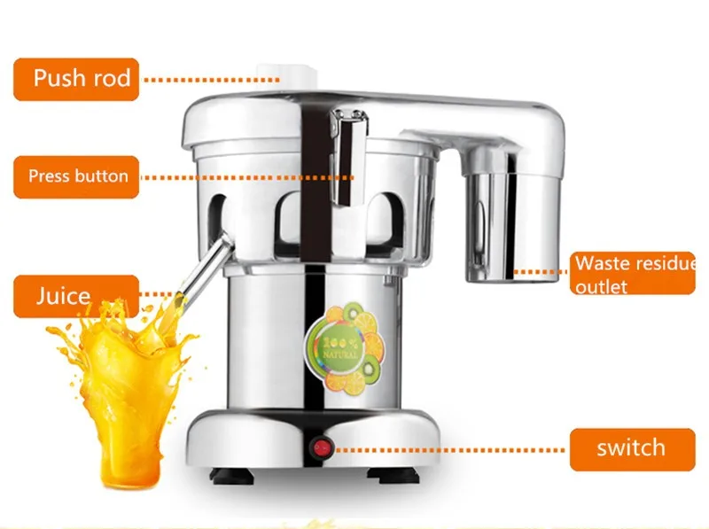 1. The outer shell of the juicer is made of stainless steel, made by advanced technology, bright and shining, and its internal structure is compact and reasonable. All places in contact with food are made of stainless steel, which has the advantages of corrosion resistance, no rust and easy cleaning.