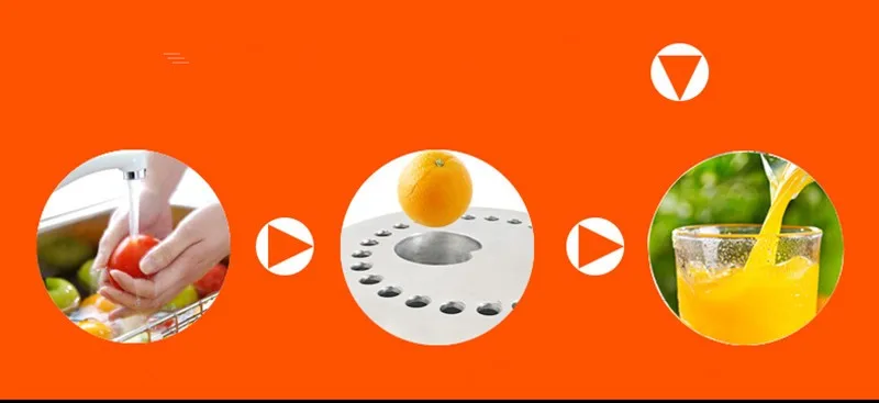 2. Super large feed port, which can squeeze all kinds of fresh fruits, vegetables, such as; watermelon, cantaloupe, apple, pear, orange, grapefruit, radish, celery and so on. This process is very simple: it is easy to make juice fast with yield 75%.