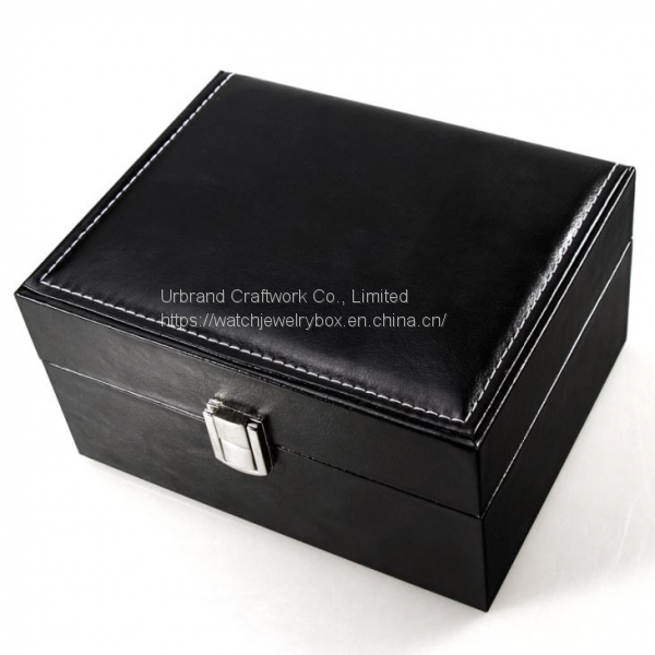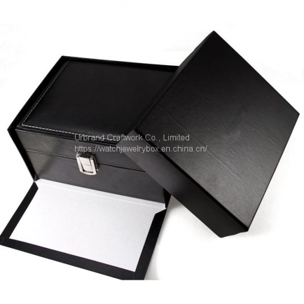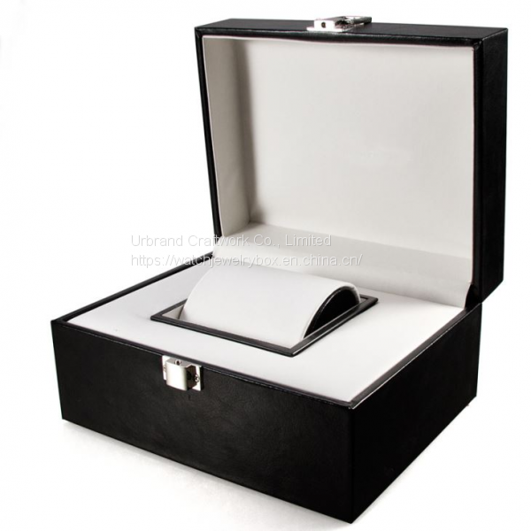 Wooden watch box covered black, PU outside, the lining is white PU leather, fixed metal lock.