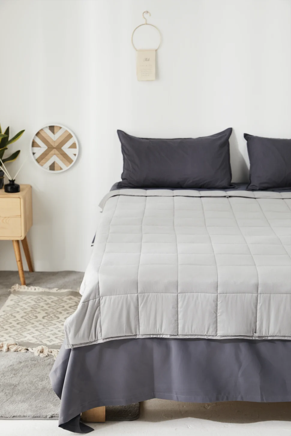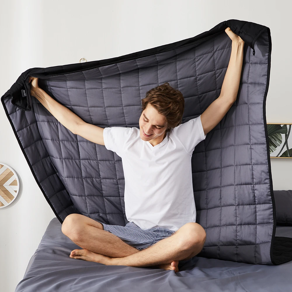 A weighted blanket is a blanket that heavier than a normal blanket. Its weight ranging from 5 lbs to 25 lbs, which is about 7%-10% of the user's weight. The pressure from the weight provides an effect called "deep pressure touch stimulation", which increasing melatonin and serotonin production of the body. Those hormones are essential in helping people calm down and fall asleep. This is how weighted blanket provides a better sleep. For countless people who suffering from Insomnia and autism, this is the thing they can't miss.