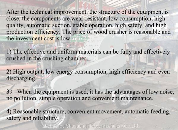 The crushed materials are widely used as the primary raw materials for biomass particles, wood-based panels, machine-made charcoal, organic fertilizers, etc., and can also be further processed into sawdust as a culture medium for edible fungi for breeding. It is also a raw material required by power plants, biomass pellet plants, and wood-based panel plants. It is also the equipment needed for landscaping work. It can operate without foundation, and the equipment can be operated when it is placed on the ground. It is driven by a single motor, which saves power and electricity.
