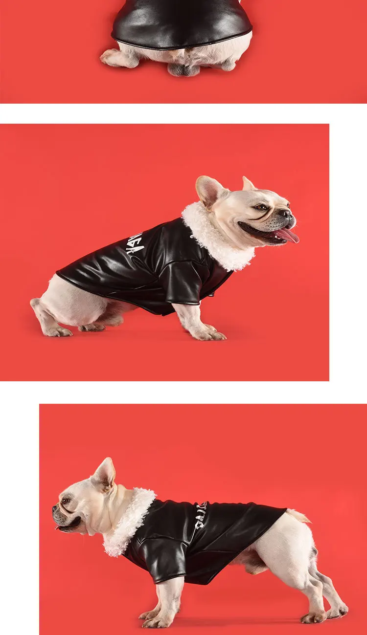 Punk Bulldog Leather Jacket Fat Dog Lamb Fur Collar Black Coats PU Clothes