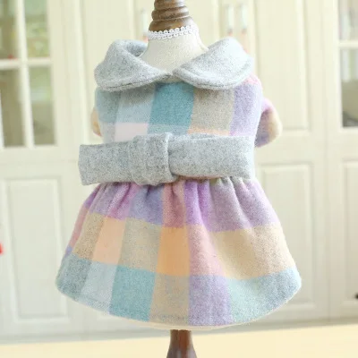 Cute Pet Dog Cat Woolen Plaid Ladies Dress Puppy Apparel Fleece Bowknot Clothes
