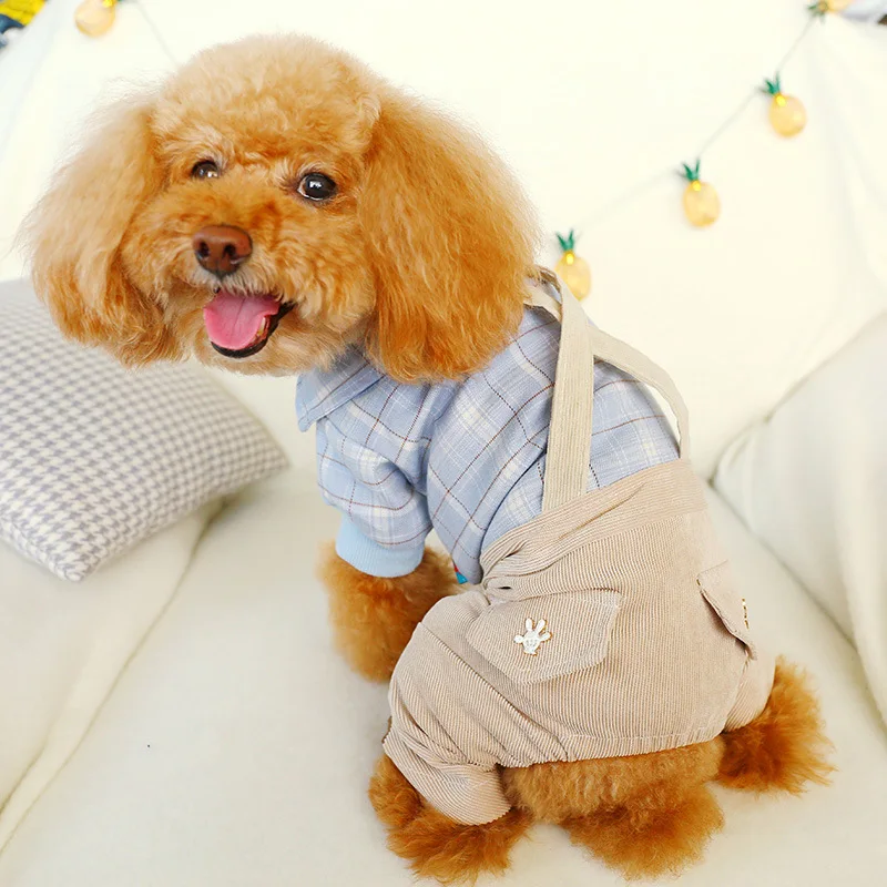 Pet Dog Kitty Plaid Shirt Suspender Trousers Jeans Four Feet Teddy Puppy Clothes