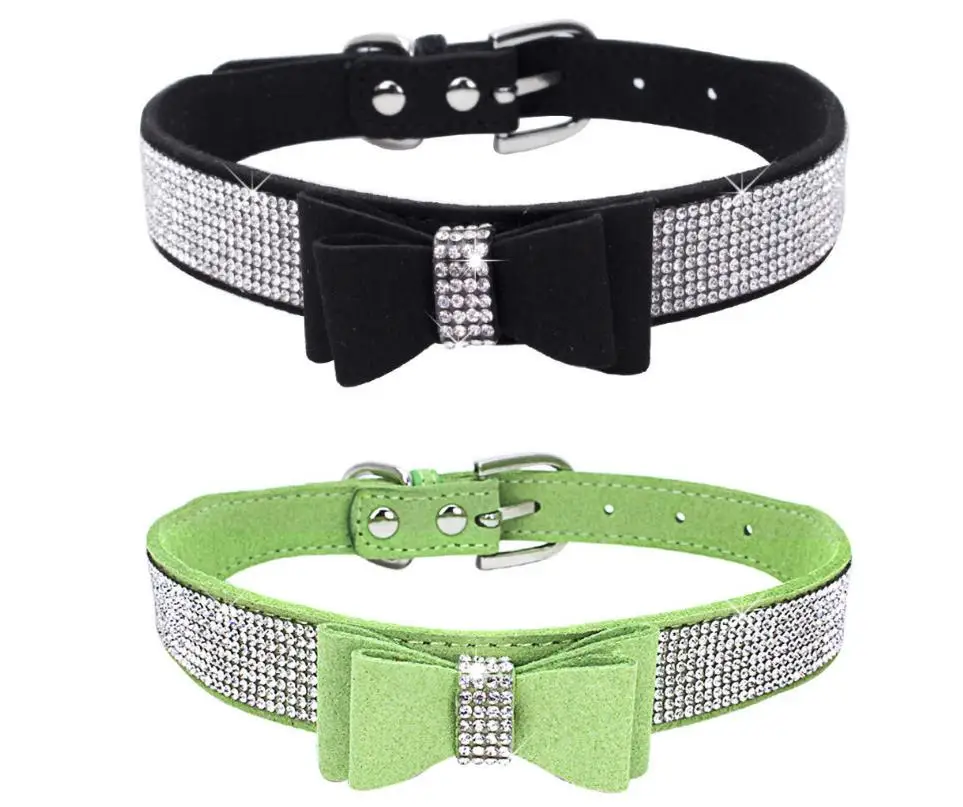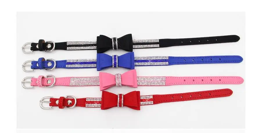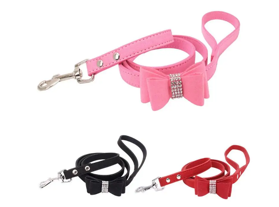Diamond Embedded Butterfly Knot Adjustable Pet Collar Leather Leash Training Dog Pulling Rope Pet Neck Chain Pet Supplies