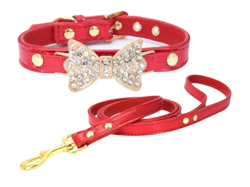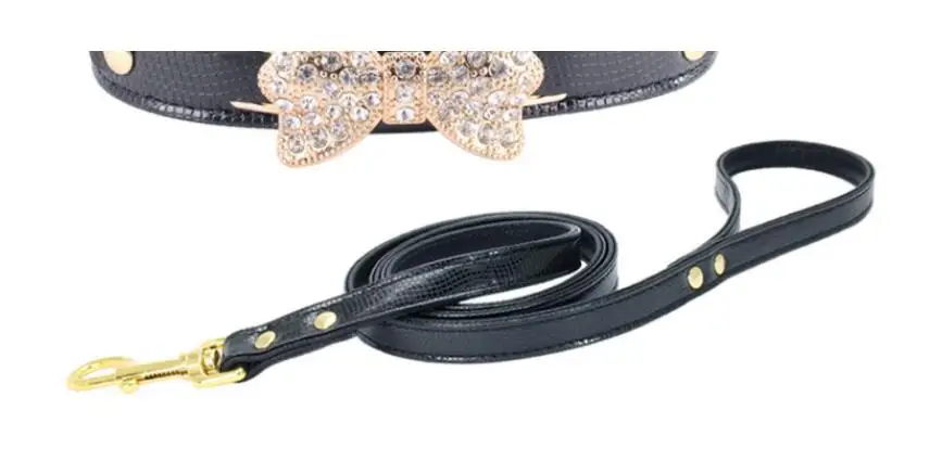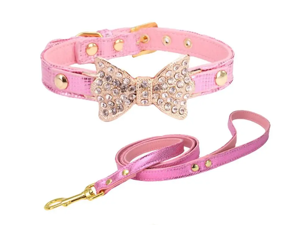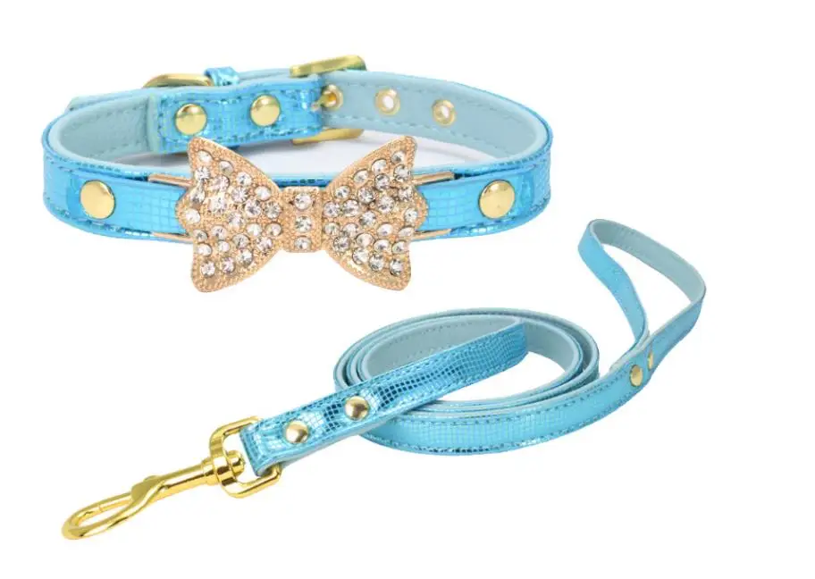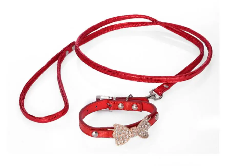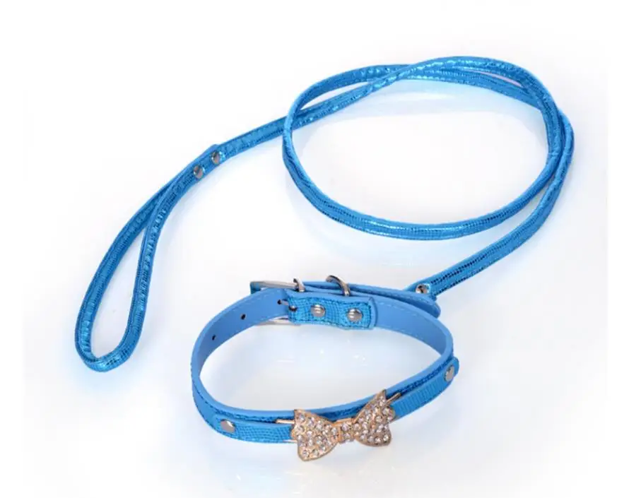 Colorful Bright Diamond Butterfly Knot Pet PU Collar Leash Training Dog Pulling Rope Pet Neck Chain Pet Supplies