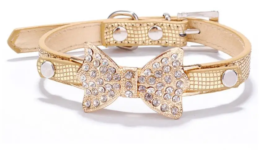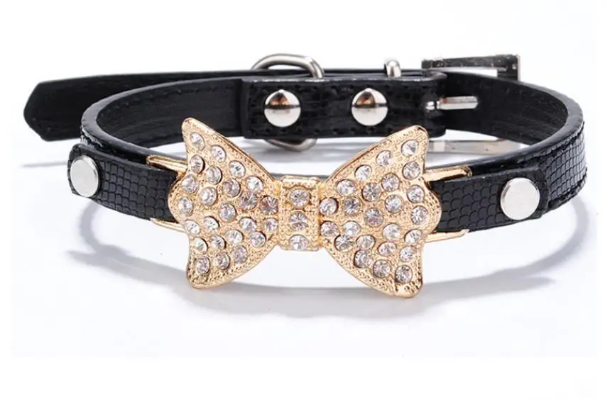 Diamond Embedded Butterfly Knot Adjustable Pet Collar Leather Leash Training Dog Pulling Rope Pet Neck Chain Pet Supplies